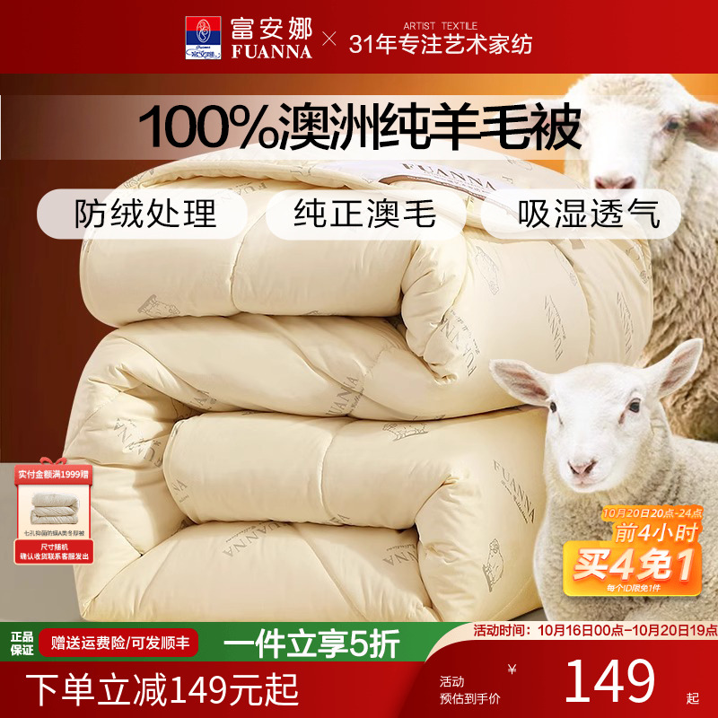 富安娜羊毛被100%澳洲进口羊毛保暖加厚冬被子驼绒被秋冬被芯婚庆