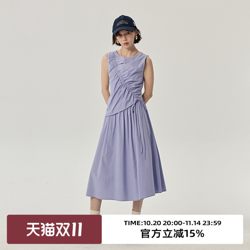 郭九九呢天丝棉简约收腰显瘦不规则拼接无袖连衣裙夏季设计感长裙