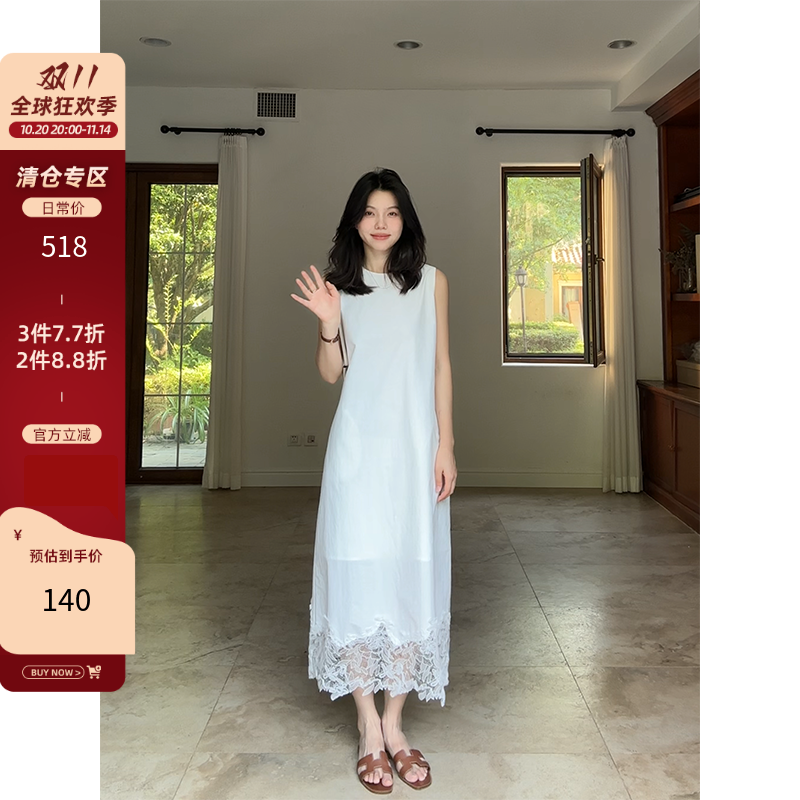 郭九九呢 100%棉蕾丝花边宽松显瘦圆领背心无袖连衣裙夏季长裙