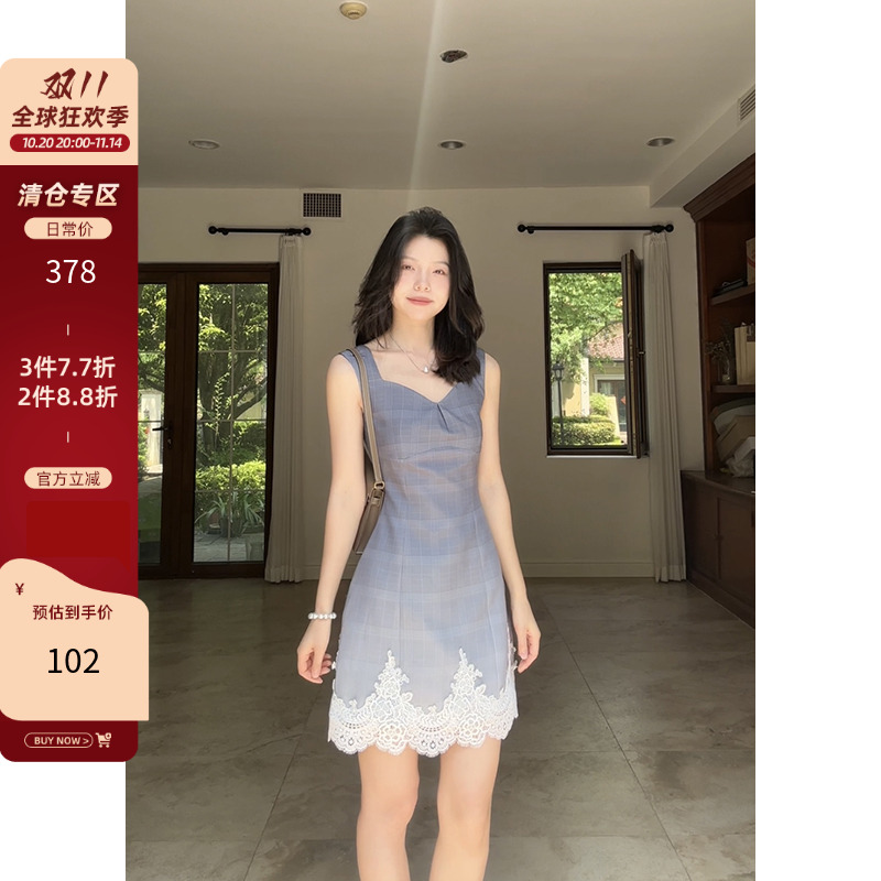 郭九九呢法式气质设计感渐变收腰显瘦拼接蕾丝无袖连衣裙夏季裙子