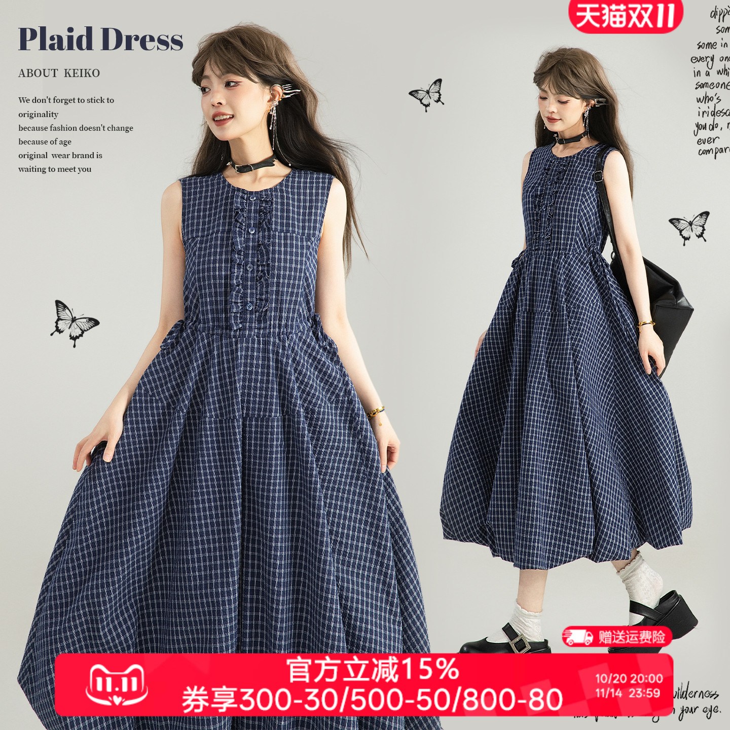 KEIKO 日系文艺风藏蓝格子无袖连衣裙夏季抽绳收腰蓬蓬花苞长裙子