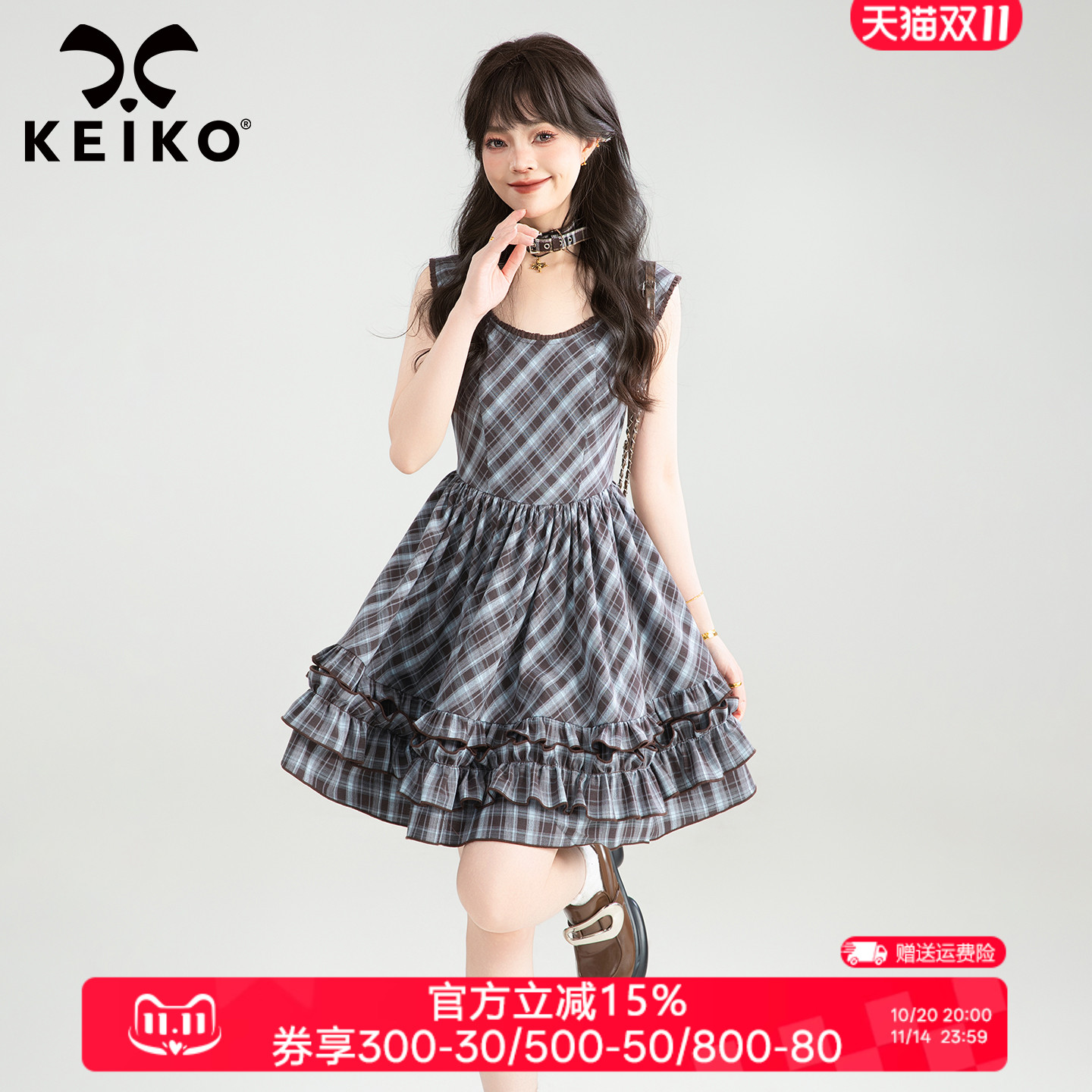 KEIKO法式褶皱花边格子无袖连衣裙夏季可露丽复古显瘦U领背心短裙