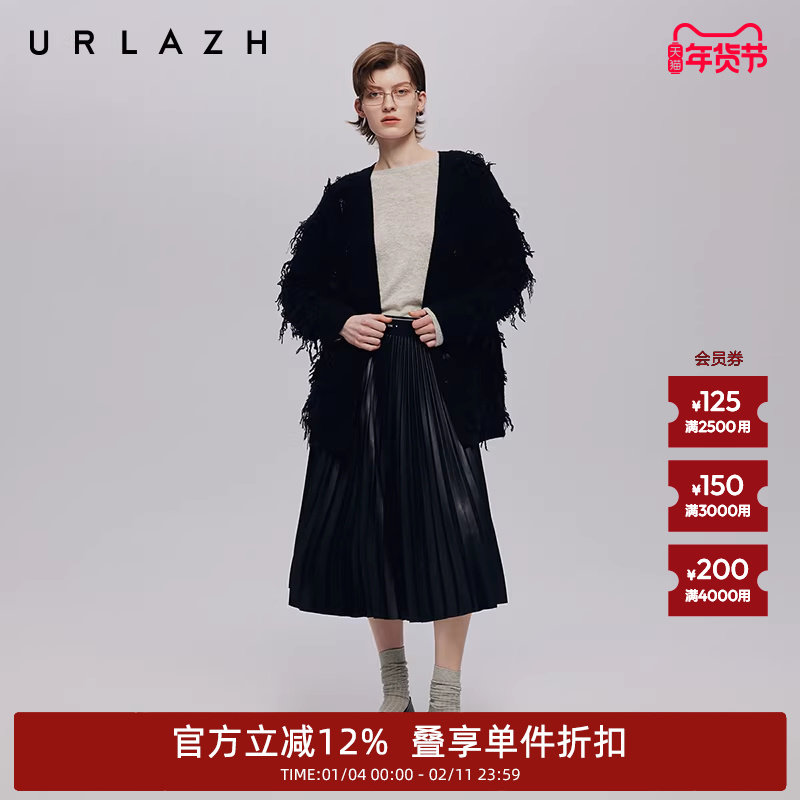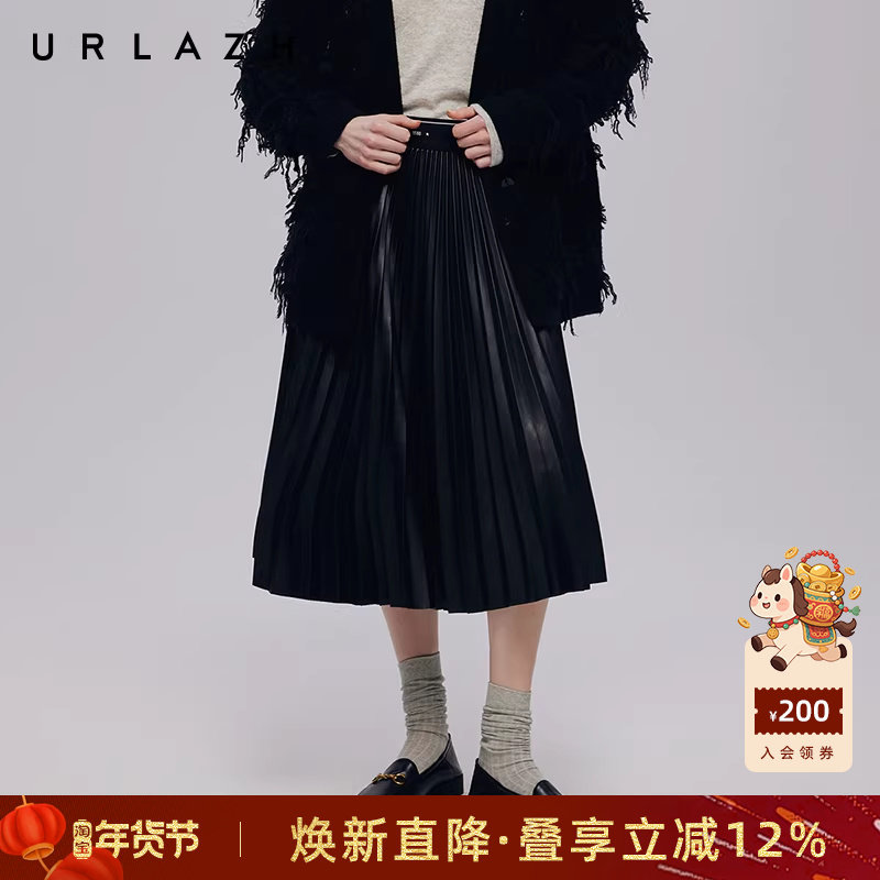URLAZH有兰秋季新款简约气质百搭纯色高腰潮酷百褶A字半身皮裙女