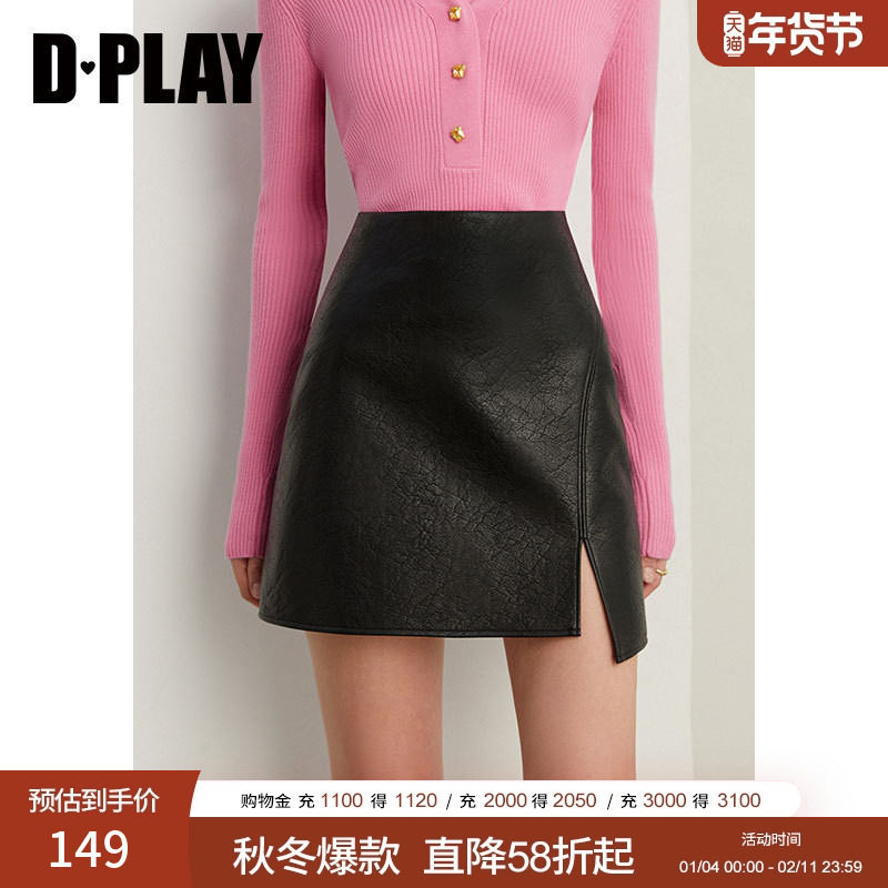 DPLAY2026年春季新款褐色半身裙女短款开叉裙子皮裙A字半裙短裙