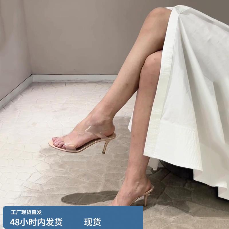 2025新款露趾漆皮透明PVC一字带侧空凉鞋女性感裸色细跟高跟鞋女