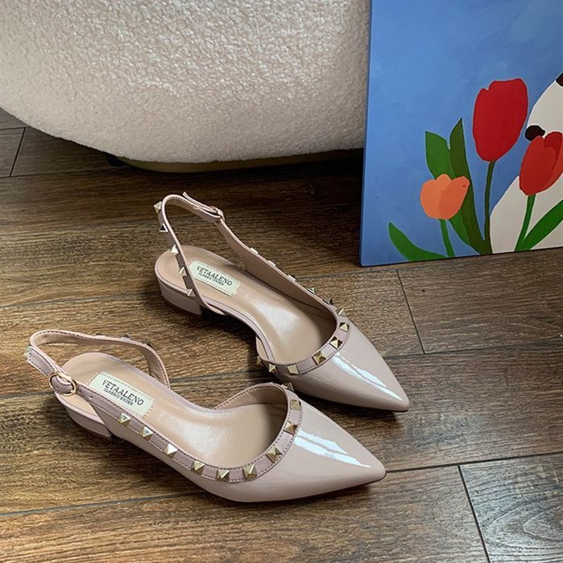 裸色铆钉侧空高跟鞋v家绝美尖头单鞋御姐一字扣低跟包头凉鞋女3cm