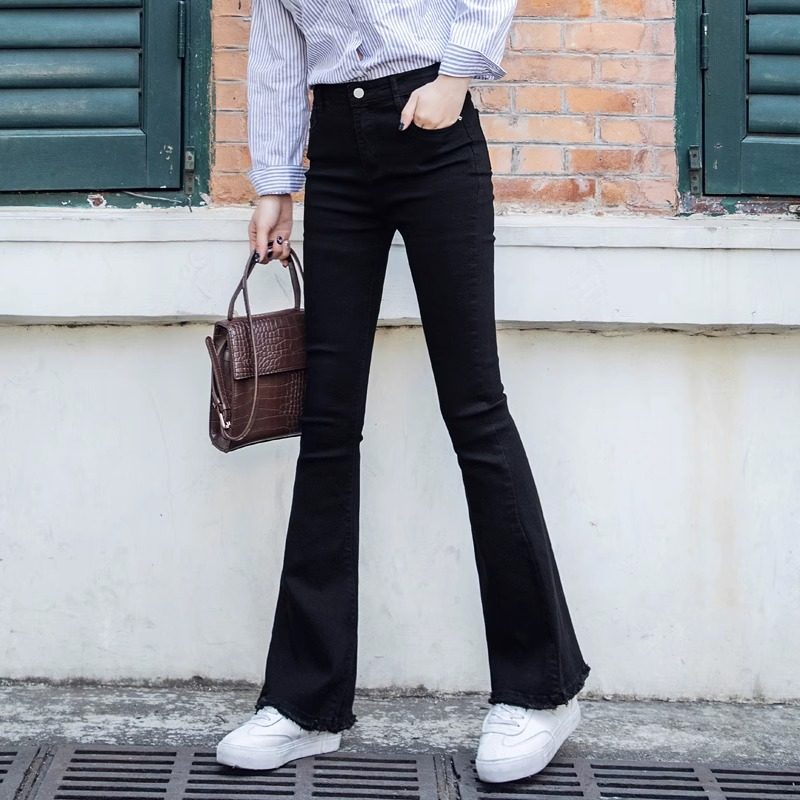 韩国黑色微喇叭牛仔裤女九分2025秋高腰弹力155小个子毛边喇叭裤