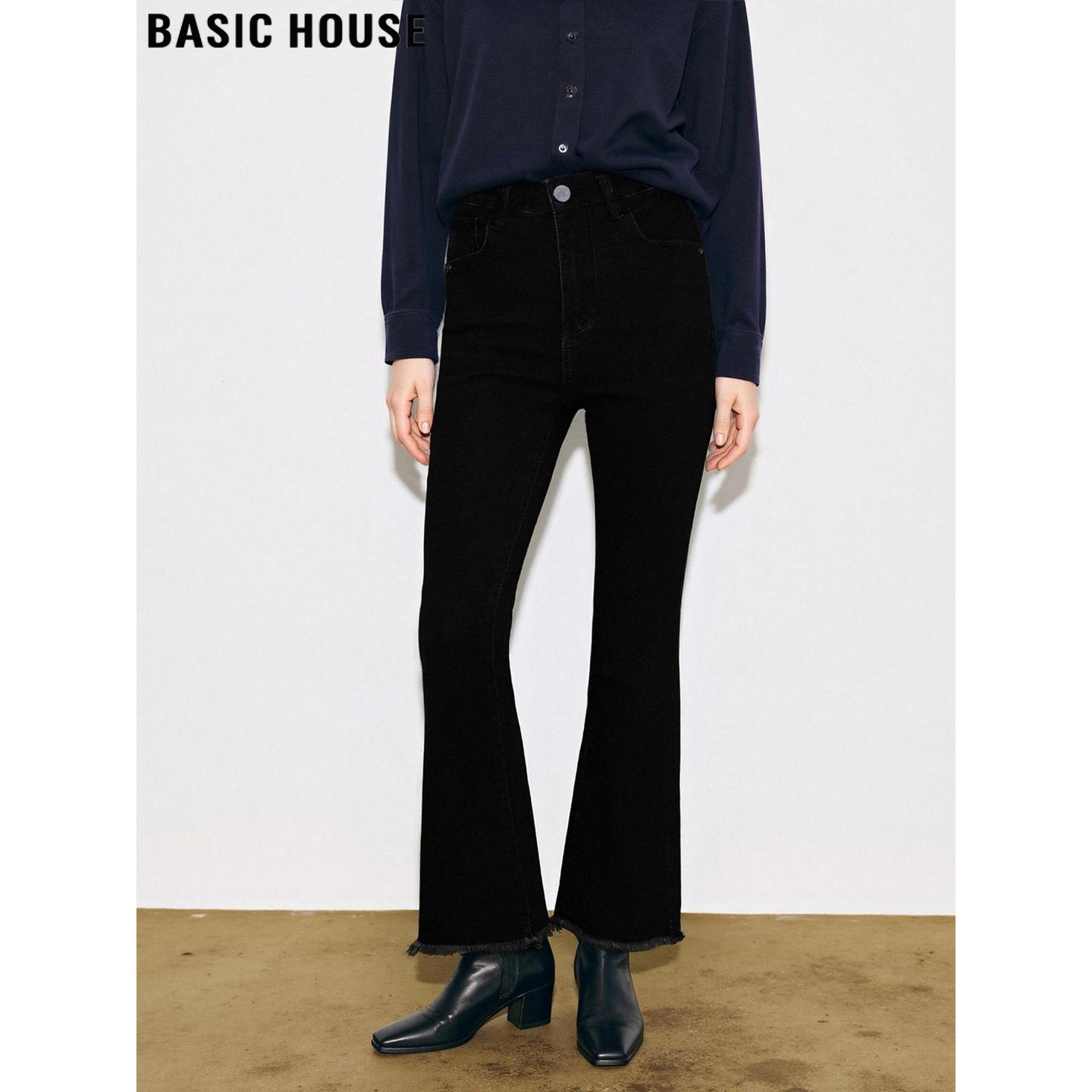 Basic House/百家好黑色九分微喇牛仔裤女冬季加绒高腰毛边喇叭裤