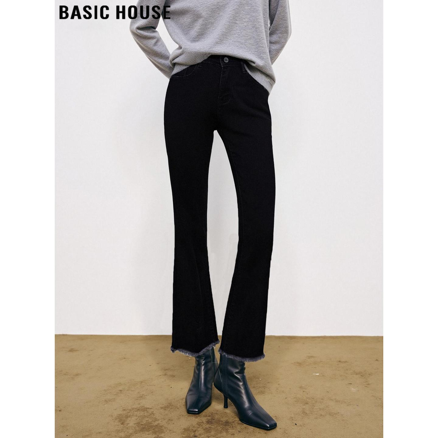 Basic House/百家好黑色九分毛边微喇牛仔裤女冬季加绒加厚喇叭裤
