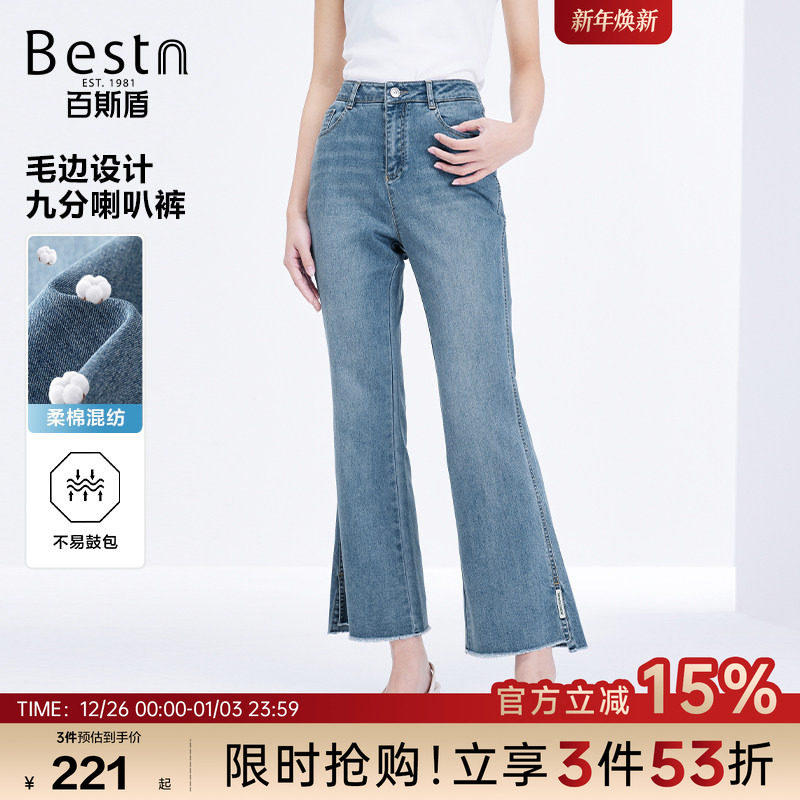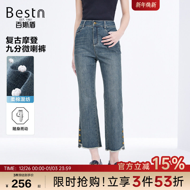 百斯盾女装牛仔裤2025年夏季新款摩登复古舒适高弹九分毛边喇叭裤