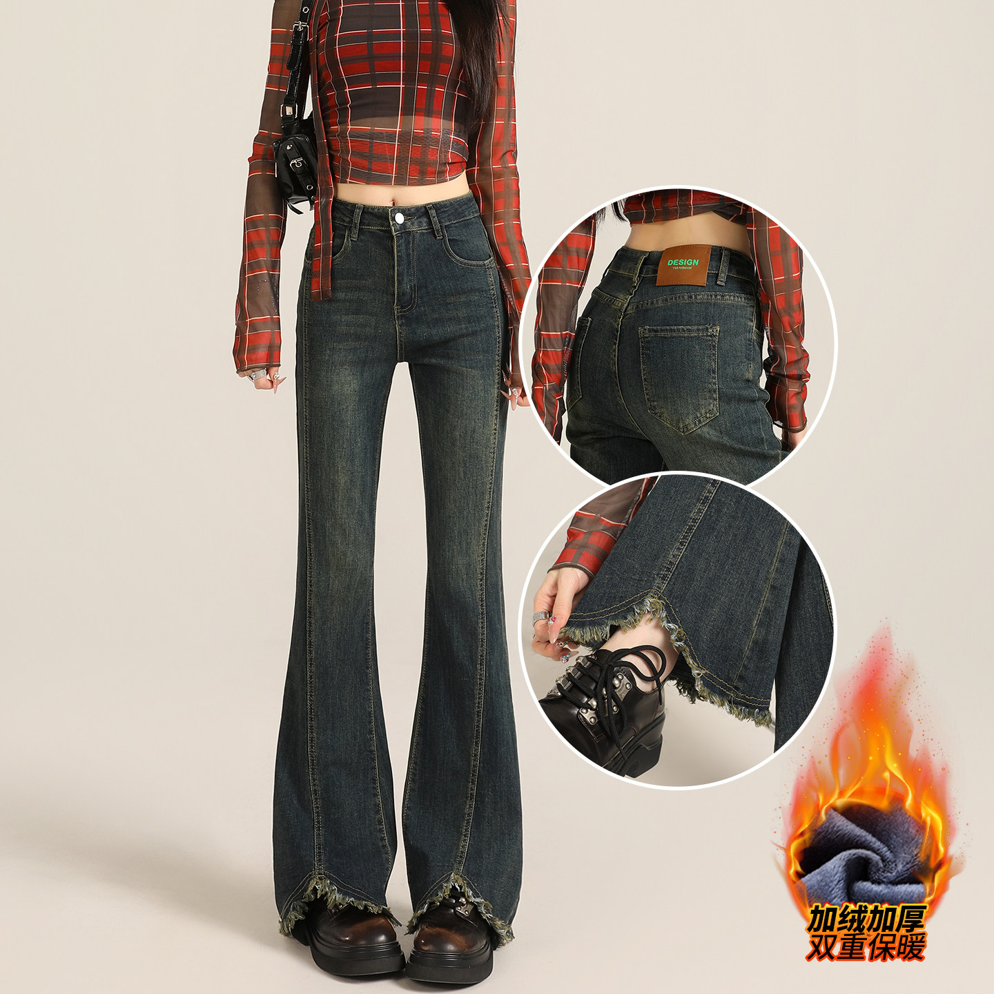 复古加绒加厚牛仔裤女春秋款小个子九分高腰显瘦修身毛边微喇叭裤