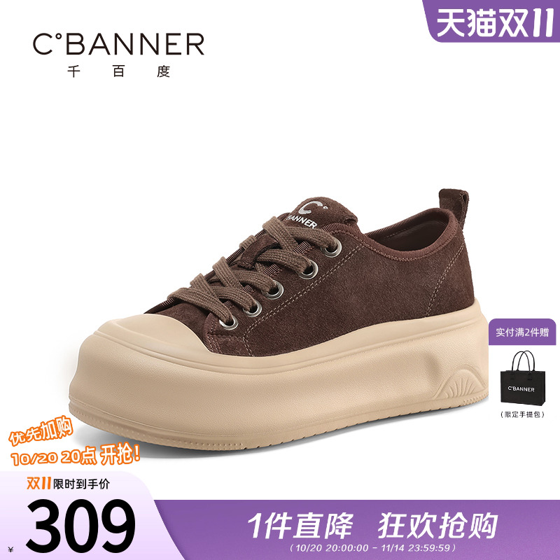 千百度厚底板鞋女2025秋季新款小白鞋女复古百搭运动休闲帆布鞋女
