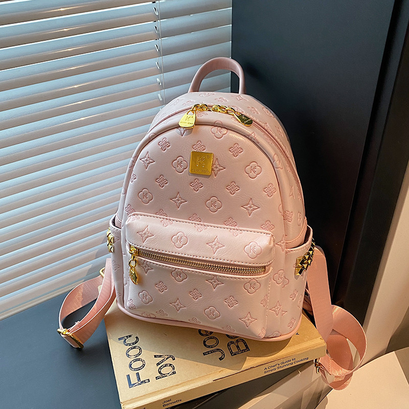 潮品时尚压花粉色双肩包包女2026新款高级感铆钉书包旅行小背包女