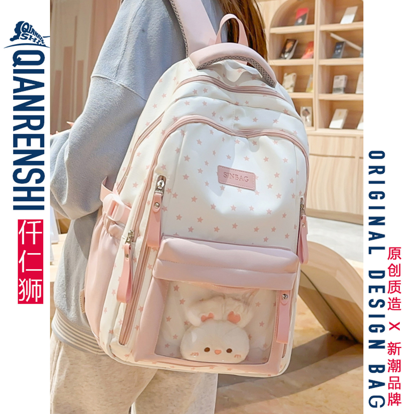 奶呼呼~小兔粉色双肩包ins小众女包男款初中小学生上学可爱高颜值