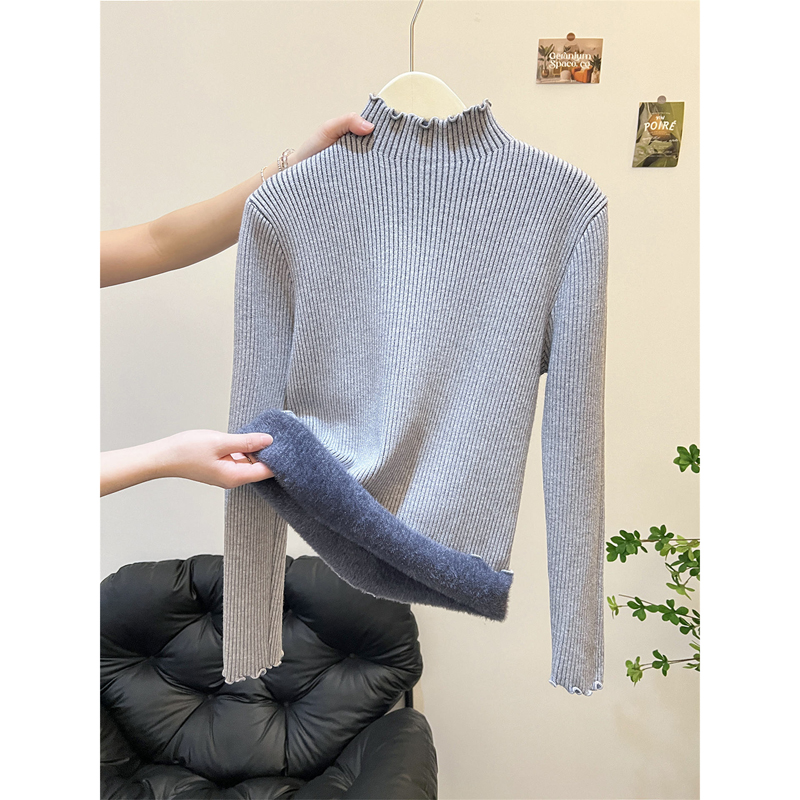 木耳边半高领长袖打底针织衫上衣秋冬季加厚一体绒保暖毛衣女内搭