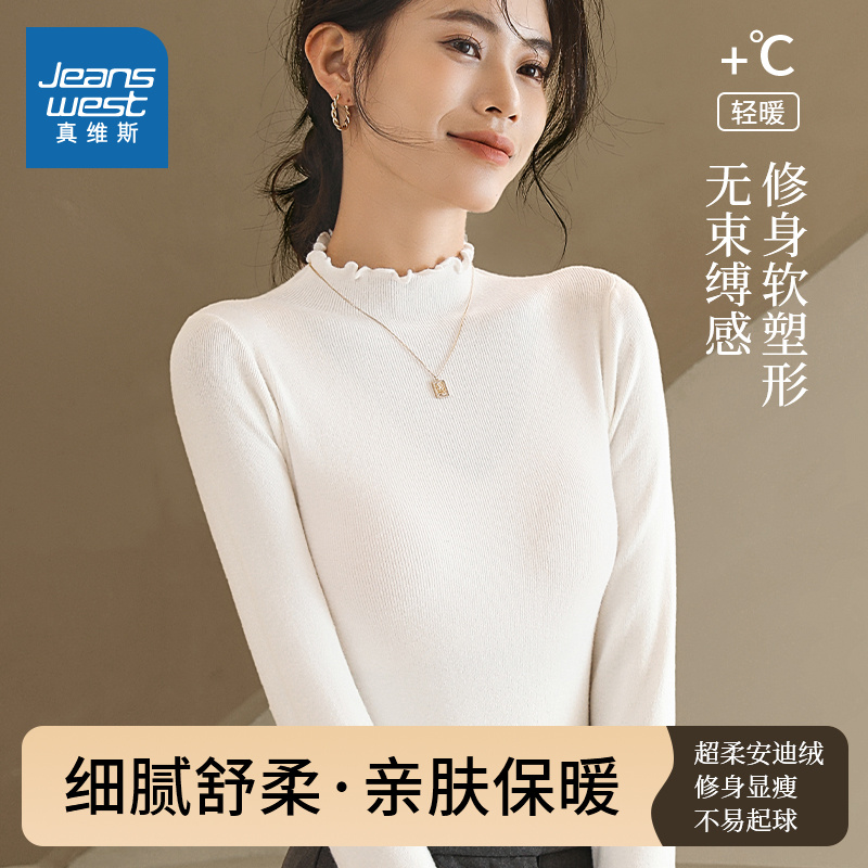 木耳边半高领长袖打底针织衫上衣秋冬季加厚一体绒内搭毛衣女保暖