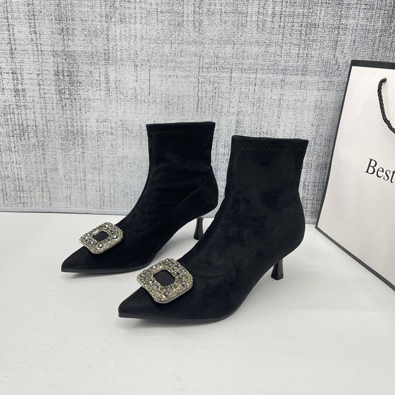 尖头方扣细跟短靴女2025秋冬新款绒面水钻高跟及踝靴弹力瘦瘦靴子