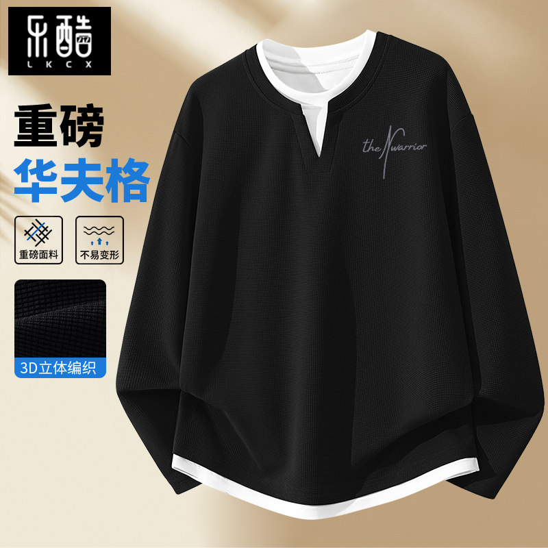 t恤男长袖春秋款2026新款华夫格v领上衣男士大码男装春季打底衫男