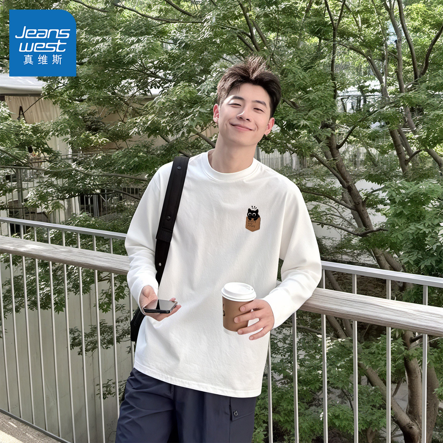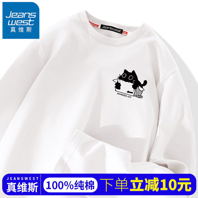 真维斯白色纯棉长袖t恤男美式潮流圆领内搭男款春季打底衫男士L