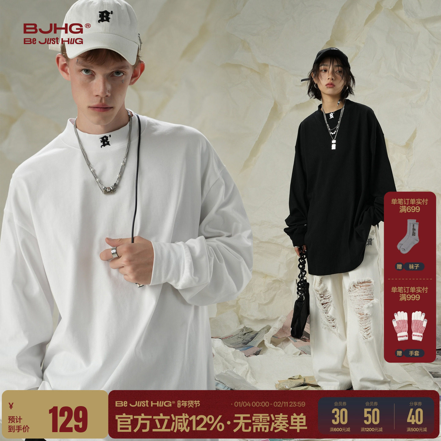 BJHG不计后果 美式纯棉长袖男t恤早春季圆领潮牌内搭打底衫卫衣女