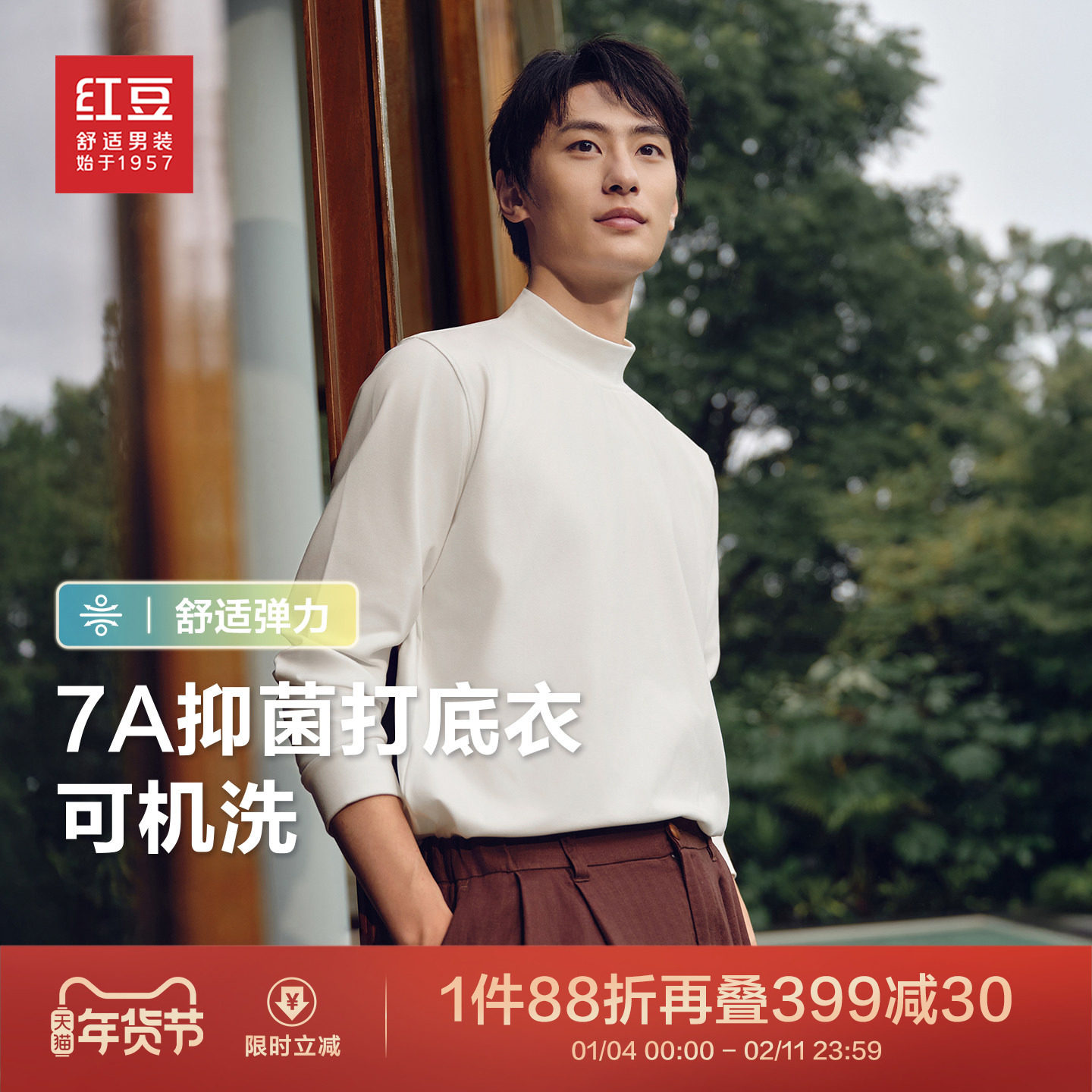 红豆半高领长袖t恤男26春季纯色弹力磨毛男士打底衫送老公送爸爸