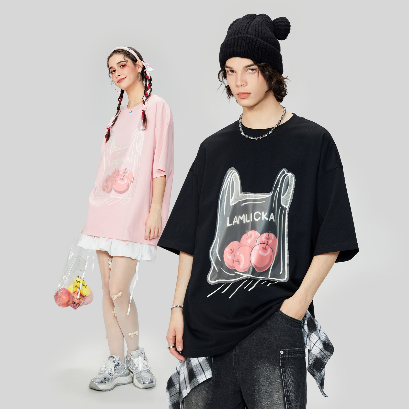 LAMLICKA透明袋苹果黑色上衣春季打底衫男款短袖宽松t恤女情侣装