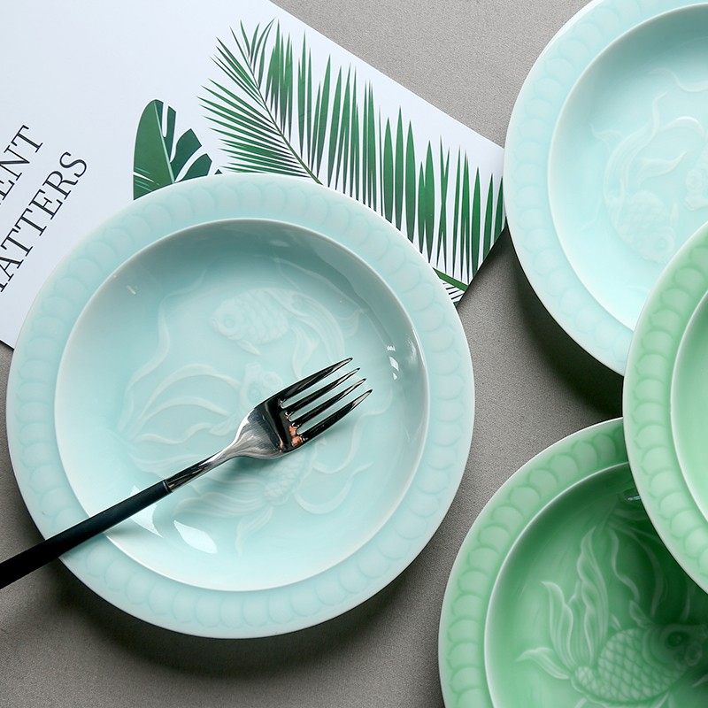 青瓷盘子 创意鱼纹盘家用菜盘中式汤盘8寸圆形盘子牛排早餐盘餐具