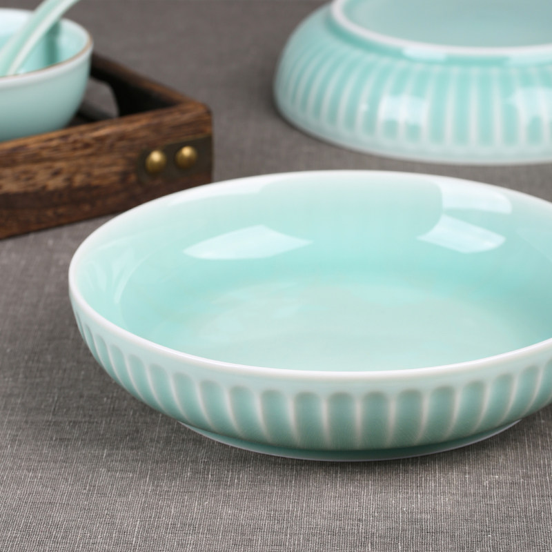 青瓷深盘汤盘家用陶瓷餐盘8英寸盘子 创意条纹菜盘饭盘早餐盘餐具