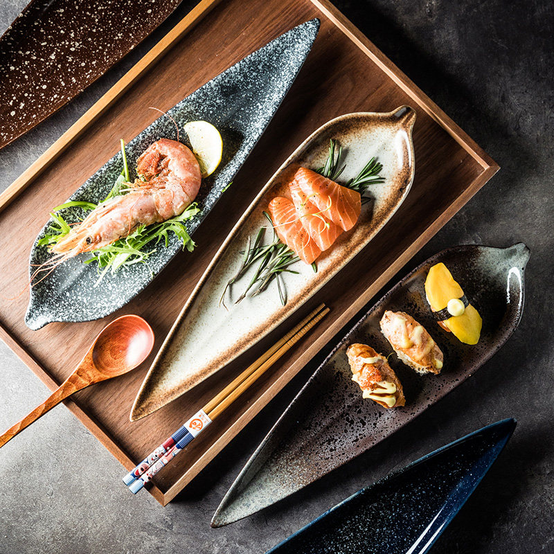 日式寿司陶瓷盘子 创意复古刺身盘平盘 料理餐具餐厅树叶长条盘子