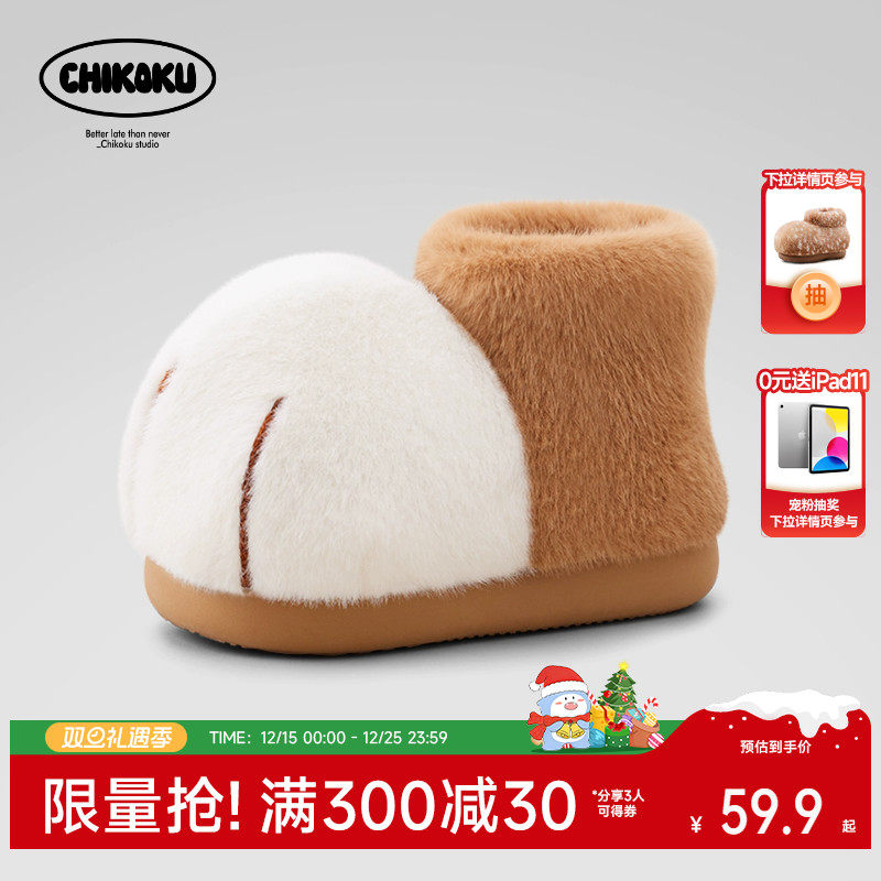 chikoku雪球大猫爪棉靴亲子包跟棉鞋女冬家居加绒保暖情侣棉拖男