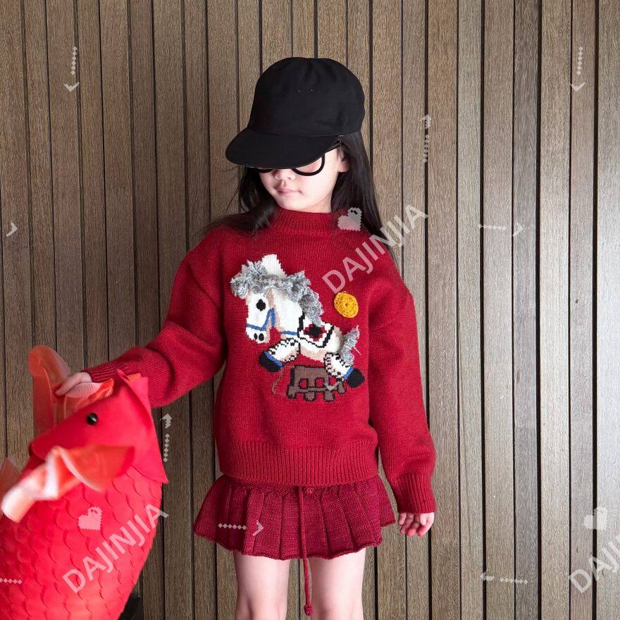 马年亲子26年跨年新品年服拜年服马上有钱手工立体红色男女宝毛衣