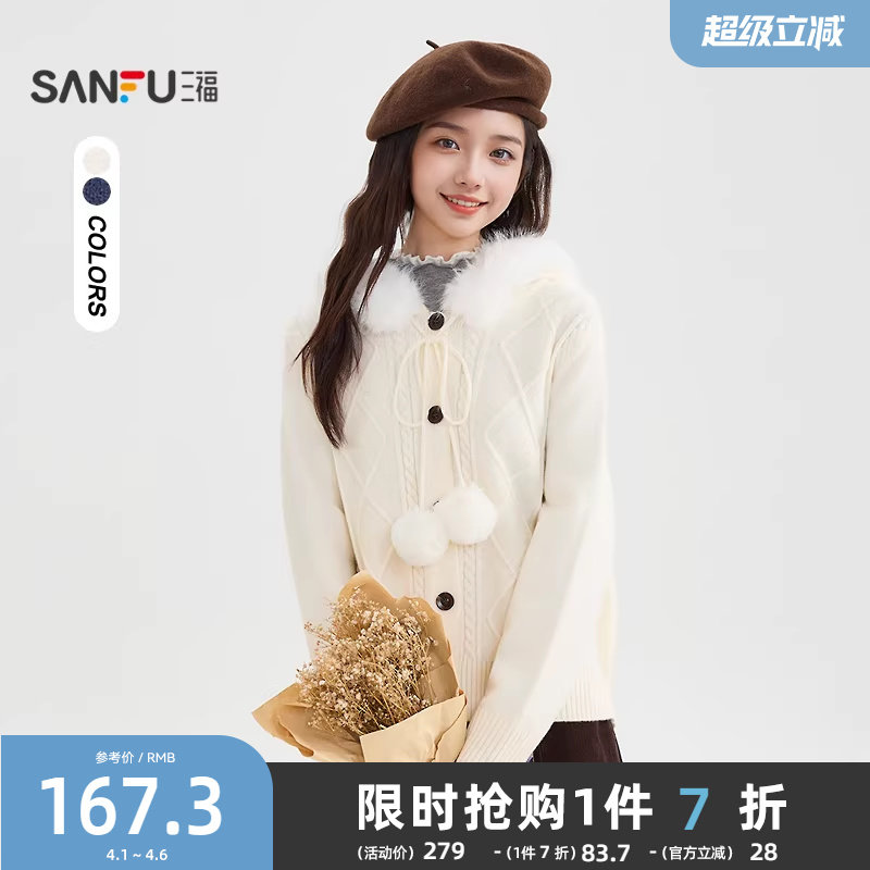 三福开衫披肩女2025新款冬季毛绒连帽宽松毛衣白色上衣女装511317