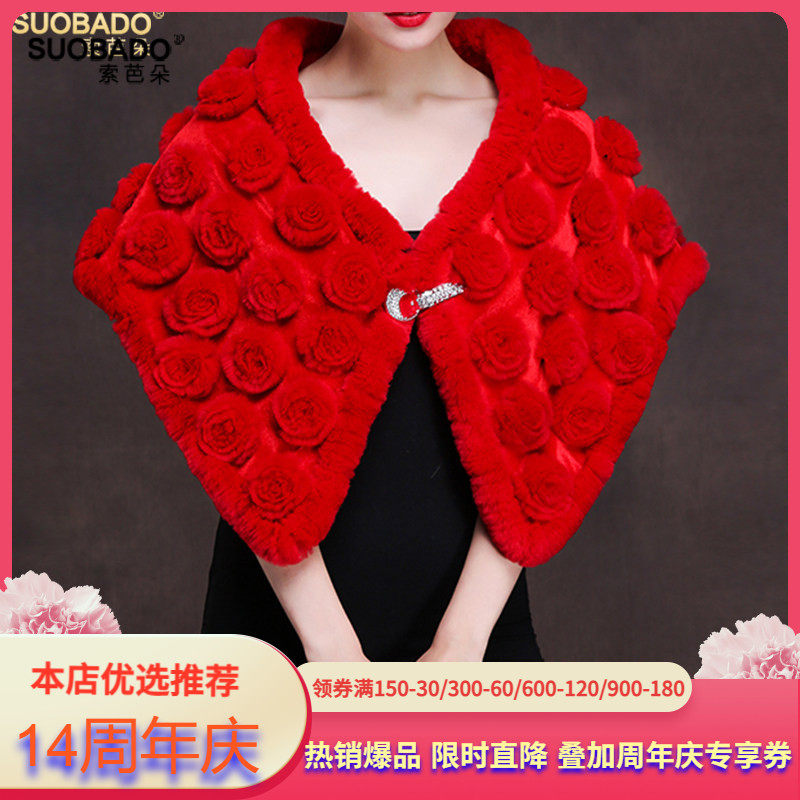 索芭朵2025新款秋冬季獭兔毛花朵丝绒斗篷坎肩 新娘婚礼皮草披肩