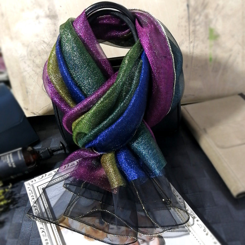 渐变撞色真丝羊毛纱巾春秋新款丝巾双层金丝珍珠钻边披肩礼服披肩