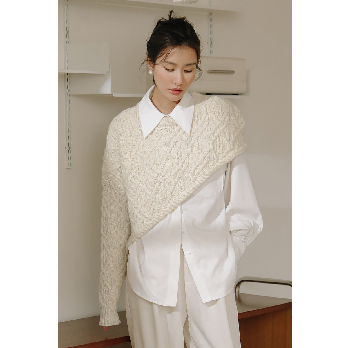 弥古白色毛衣披肩不规则套头针织衫罩衫女春季短款设计感叠穿上衣