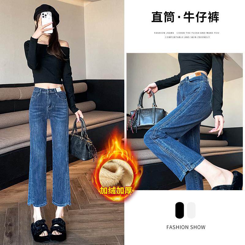 直腿滤镜!~加绒九分直筒牛仔裤子女秋冬新款百搭高弹弹力法棍裤