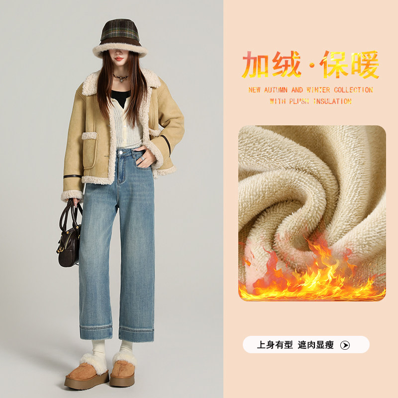 逸阳加绒保暖显瘦宽边九分直筒牛仔裤女小个子2025年冬季新款裤子