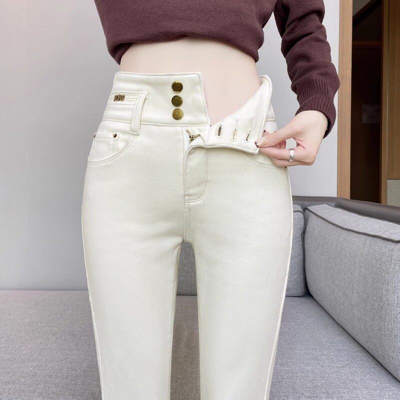 米白色牛仔裤女春秋2026新款高腰紧身靴裤弹力显瘦加绒铅笔小脚裤