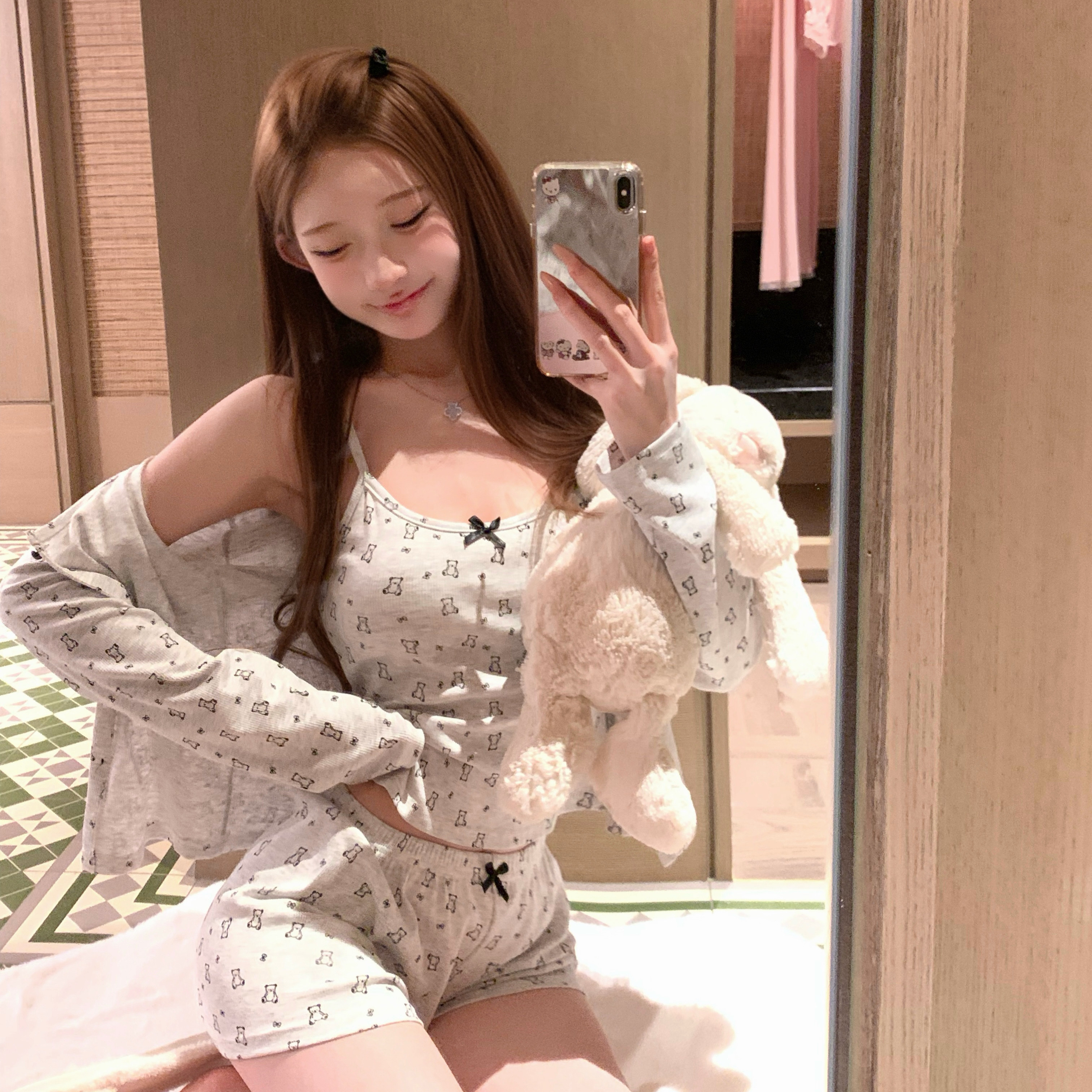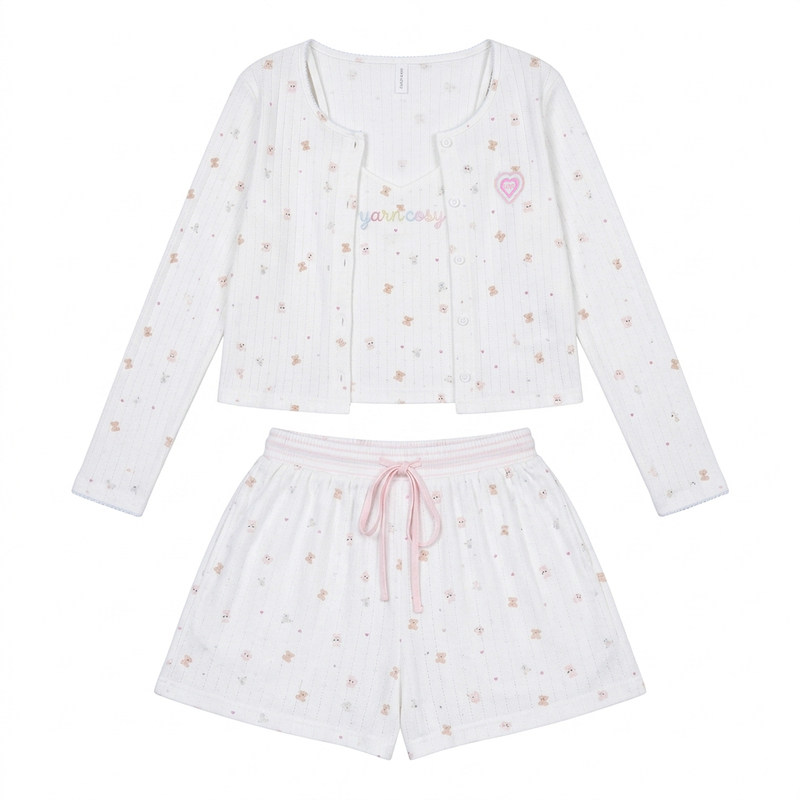 馨帮帮2025年蝴蝶结小熊印花吊带睡衣女春秋休闲外穿三件套家居服