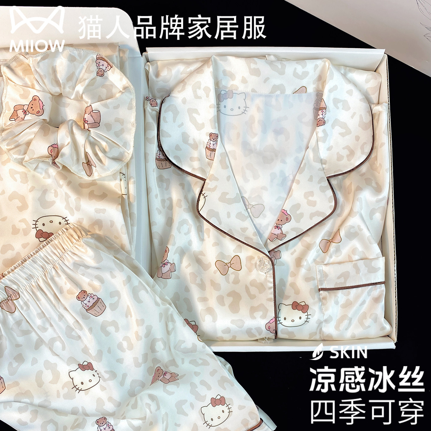 猫人真丝睡衣女夏季薄款带胸垫冰丝短袖三件套可爱KT猫送闺蜜礼盒