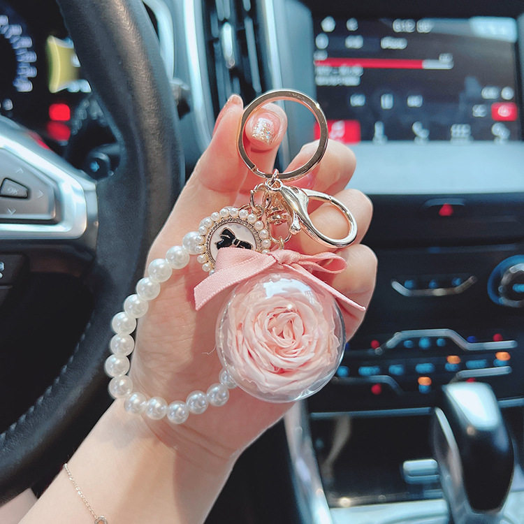 玫瑰永生花钥匙扣珍珠链节日礼品diy配饰钥匙链情人节礼物女花球