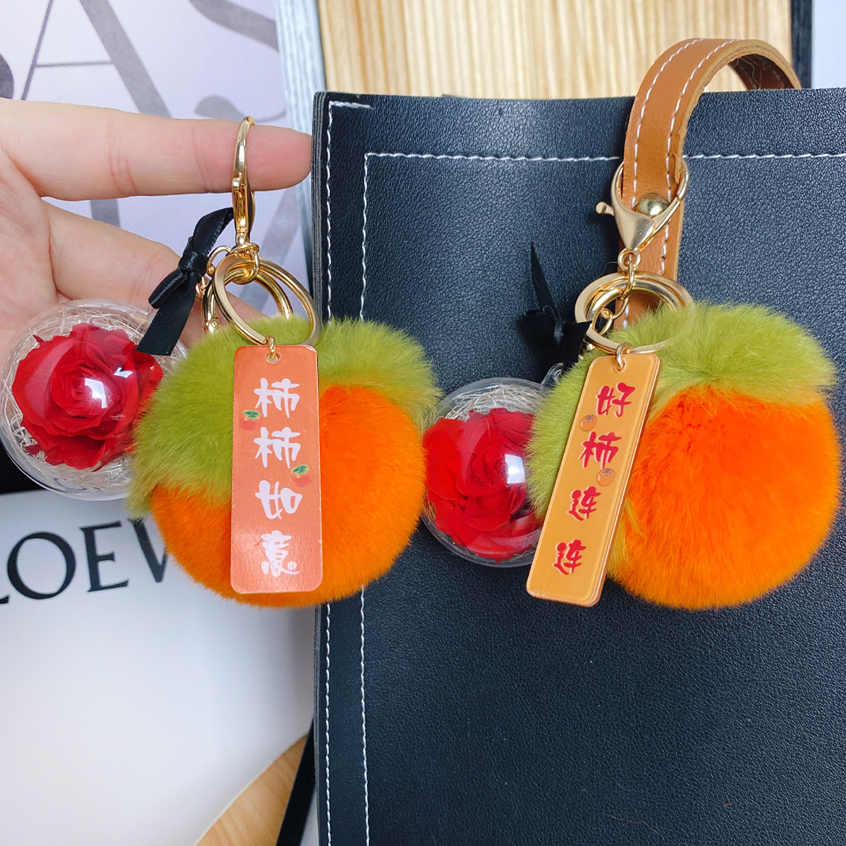 真獭兔毛皮草小柿子毛绒挂件真花永生花球礼物车钥匙扣挂饰小礼品