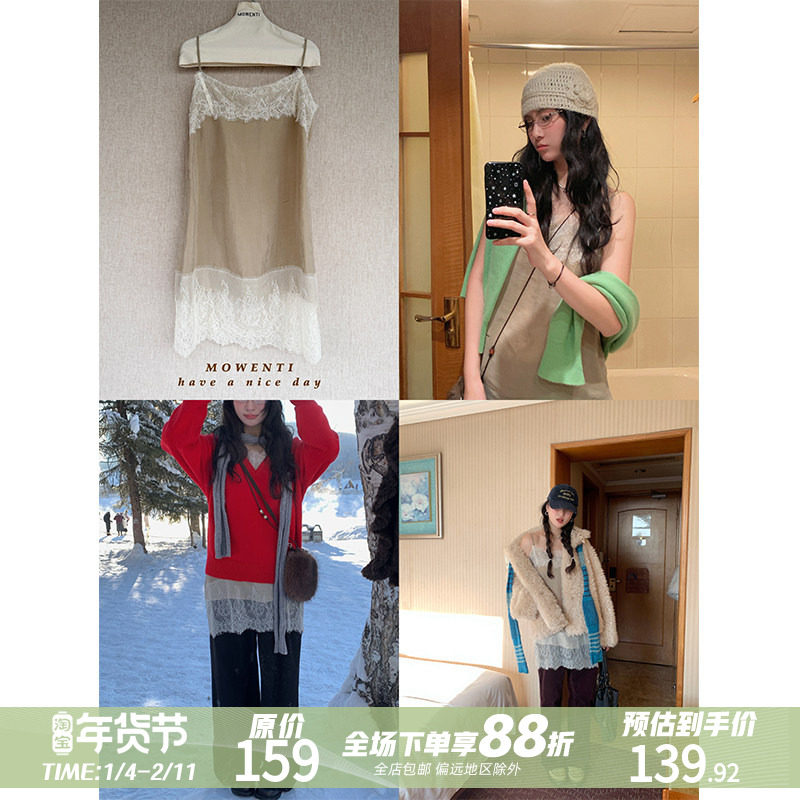 MOWENTI文文婷 浅卡其缎面蕾丝吊带裙2026年女柔雾感轻法式连衣裙