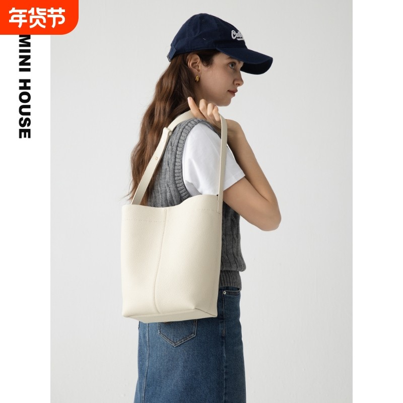 EMINI HOUSE/伊米妮头层牛皮大容量托特包白色气质简约水桶斜挎包