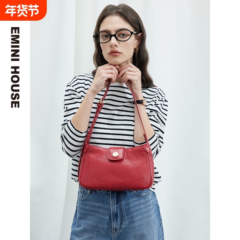 EMINIHOUSE/伊米妮气质法棍包头层牛皮红色复古单肩腋下女包化妆