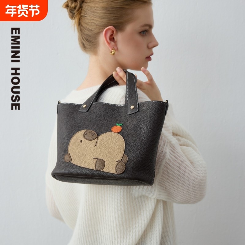 伊米妮2025通勤原创设计卡皮巴拉拉真皮手提斜挎托特包牛皮巧克力