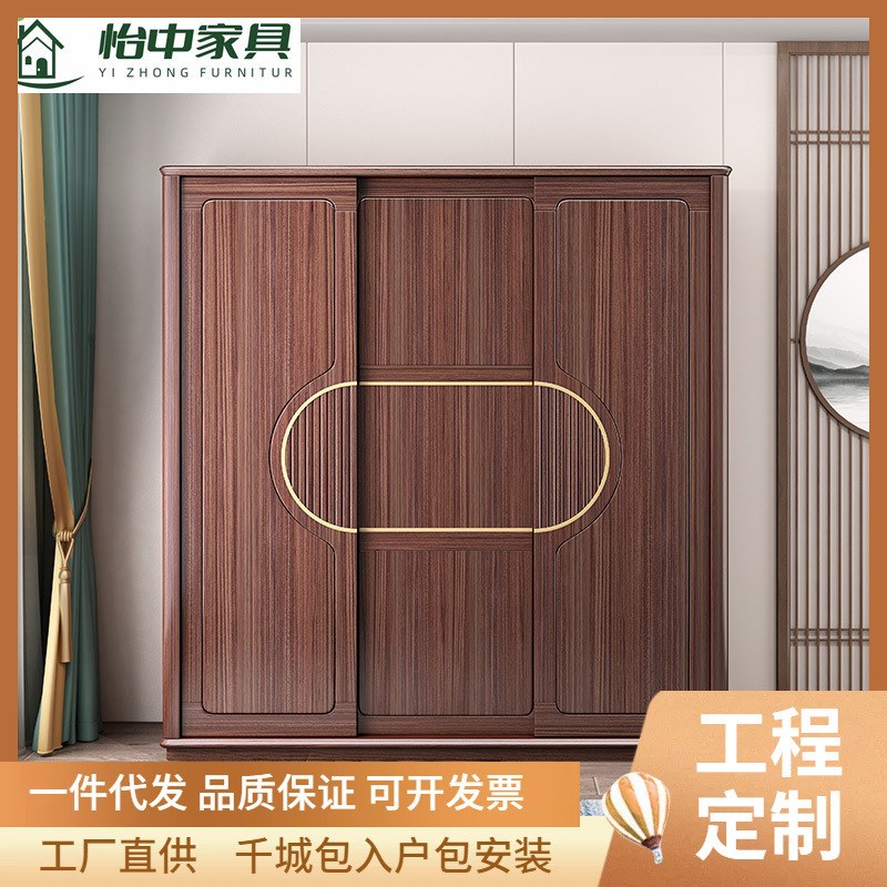 胡桃木实木衣柜3门木质滑移门家用储物收纳推拉门大衣橱紫金檀色