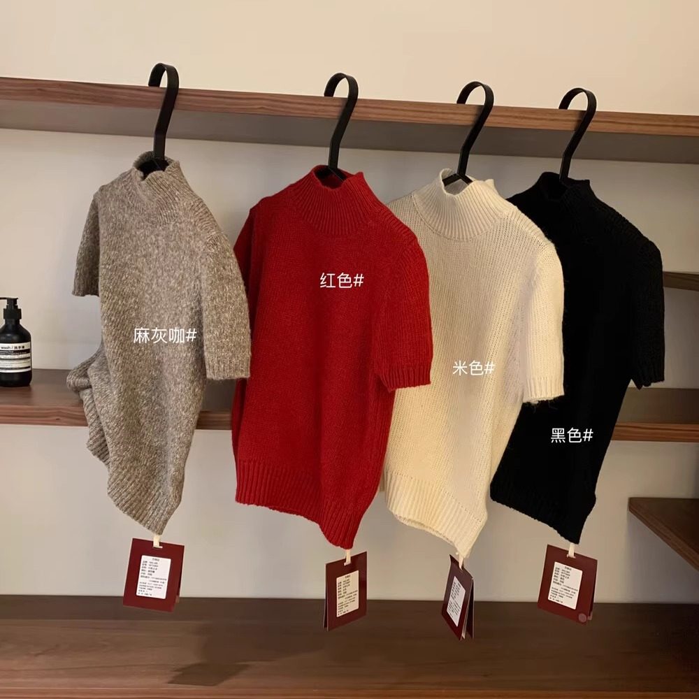 2025秋季新款半高领软糯短袖T恤针织衫女修身显瘦小立领打底上衣