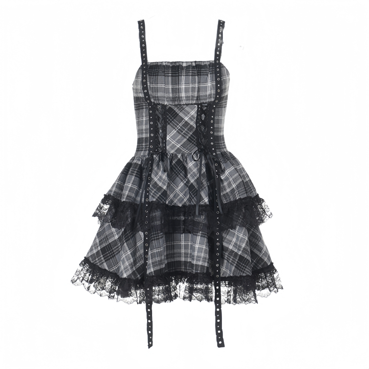暗黑哥特格子吊带裙亚文化朋克亚比黑灰格蕾丝收腰抽绳甜酷抹胸裙