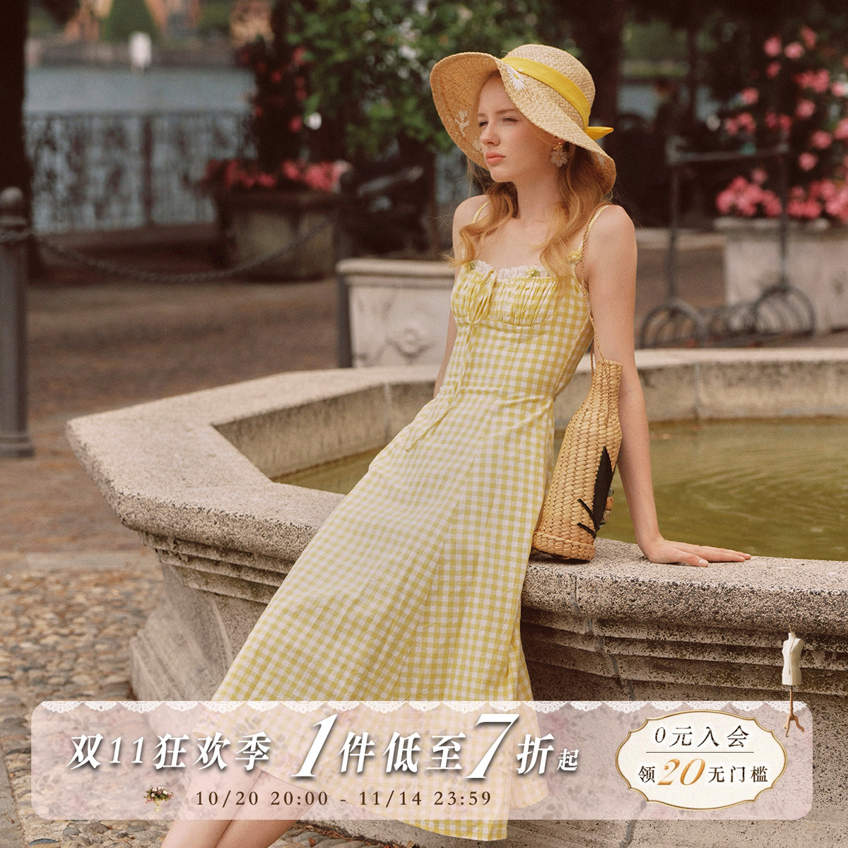 LaceMade 小柠檬 法式田园风设计感黄色格子吊带裙通勤连衣裙长款